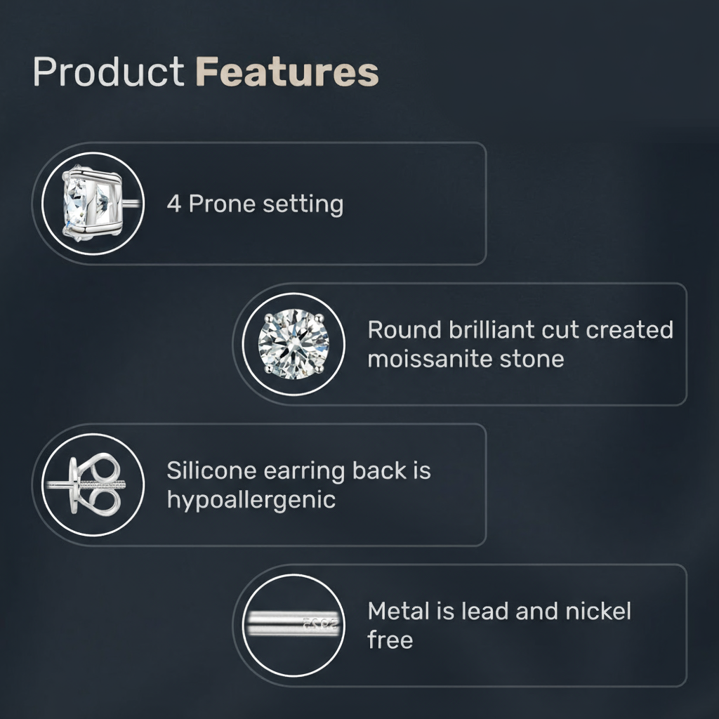 Each earring showcases a captivating round-cut moissanite, carefully selected for its exceptional clarity, brilliance, and fire. Moissanite, known for its remarkable sparkle and resemblance to diamonds, adds a touch of luxury to any occasion, making these stud earrings a versatile and sophisticated choice for daily wear or special events.