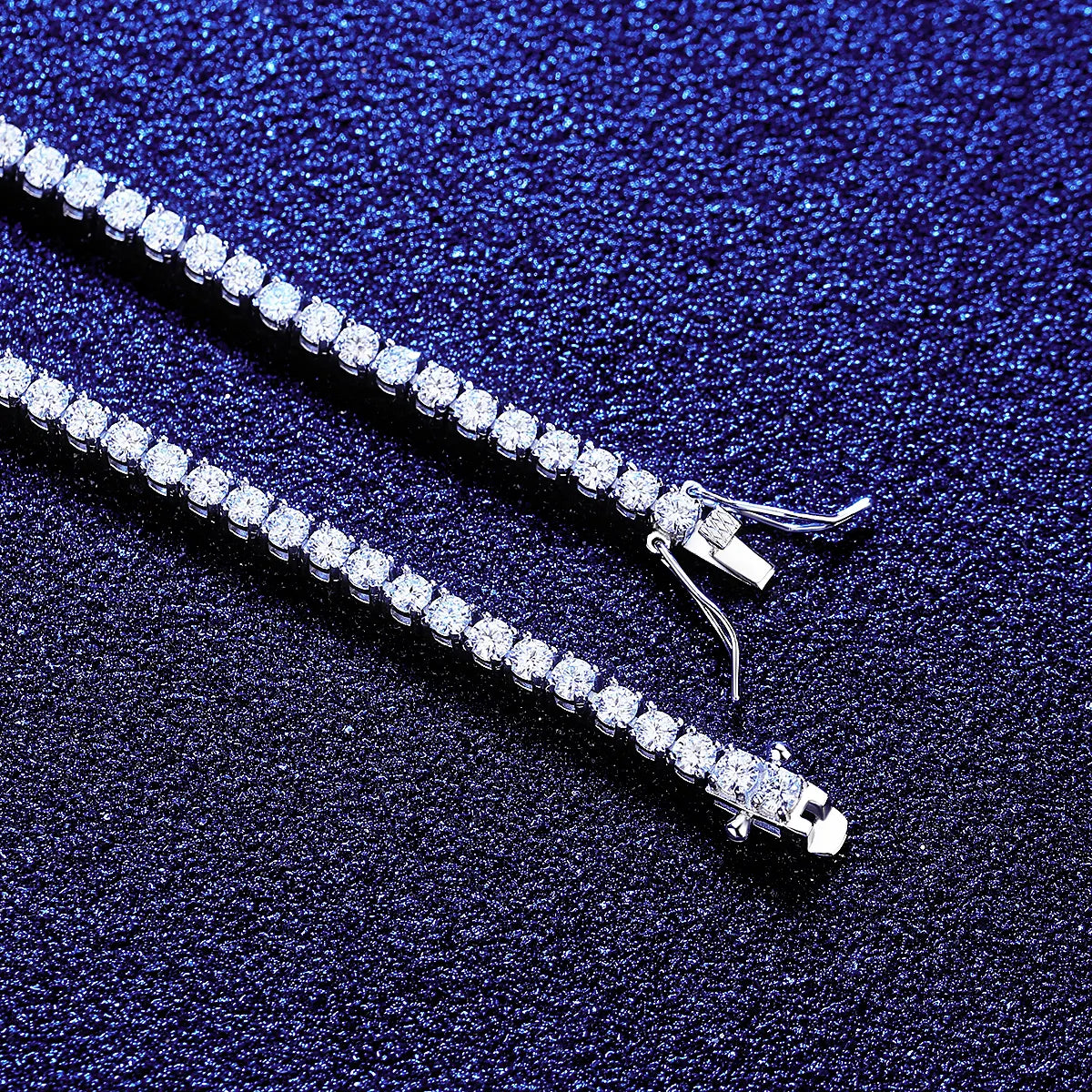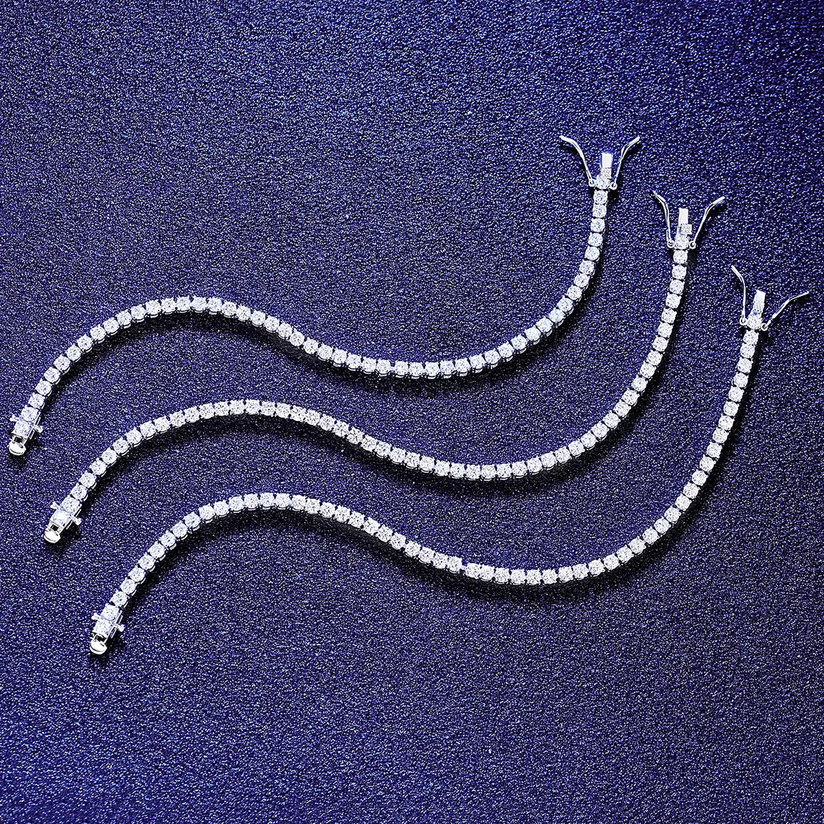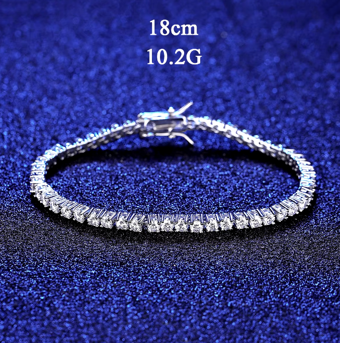 Exquisite Moissanite Tennis Bracelet in 925 Sterling Silver, available in lengths 18cm, 19cm, and 20cm with a 3mm width. Weighs 10.2g-11.3g, this sparkling piece is designed for elegance and durability. Perfect for adding a touch of luxury to any outfit. Shop now for timeless sophistication!